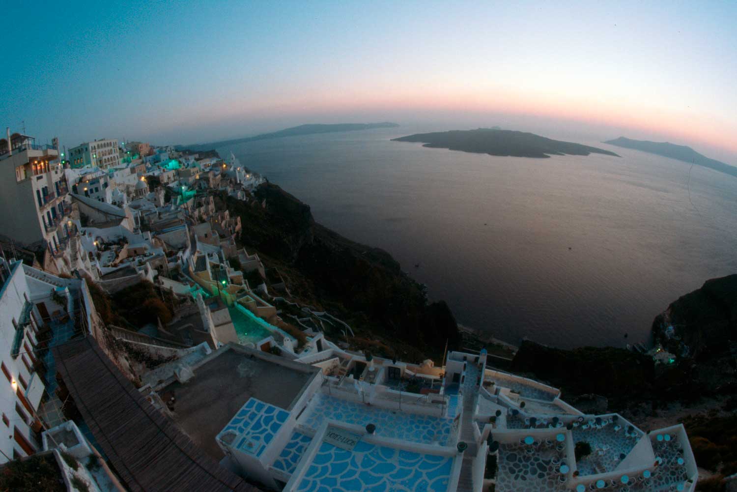 Древнейшее население острова, которое появилось здесь около 3000 года до н.э., было догреческим. Присутствие влияния Минойского Крита было установлено при раскопках на Акротири, когда из под мощного слоя вулканического пепла появилось целое поселение с двух- и трехэтажными домами, украшенными фресками, которые напоминают настенную живопись минойских дворцов. В 1967 году греческими археологами был обнаружен пемзовый туннель в Акротири, минойский город 16 столетия до нашей эры, а также город бронзового века на 30.000 жителей. Никаких скелетов, драгоценностей или золота не было найдено в Акротири, что указывает на то, что жители города знали о надвигающейся катастрофе, возможно, по земным толчкам. Во времена существования этого поселения остров, должно быть нзывался Каллиста (прекраснейший) или Стронгила (Круглый) по причине его формы, поскольку вулкан тогда еще не начал свою разрушительную деятельность. 35 веков тому назад в 1500 (1450) г. до н.э. произошло событие, решительным образом повлиявшее на историю древнего мира. Речь идет о страшном извержении вулкана, который находился в центре острова, в результате чего большая чась острова погрузилась в море.