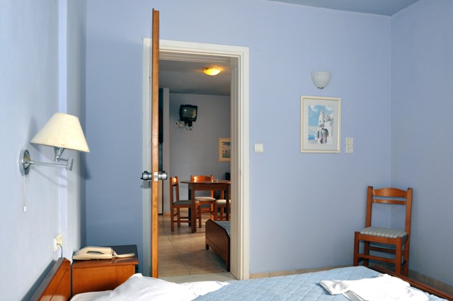 тип кровати - TWIN (односпальные кровати), дополнительная кровать - стандартная односпальная, спутниковое телевидение (российские каналы), холодильник, сейф (платно - 15 евро за неделю, 24 евро за 2 недели), кондиционер, туалет, душ, фен, кухонный уголок, принадлежности для приготовления чая / кофе, посуда, балкон или терраса.